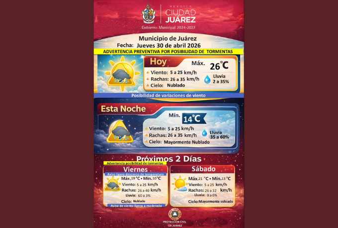 El Gobierno Municipal, a través de la Dirección de Protección Civil, emitió una alerta preventiva ante la probabilidad de tormentas este jueves 30 de abril en Ciudad Juárez, debido a la llegada del frente frío número 48 al norte del país. Las condiciones de inestabilidad podrían generar lluvias, ráfagas de viento y actividad eléctrica, por lo que se pide a la población extremar precauciones.
