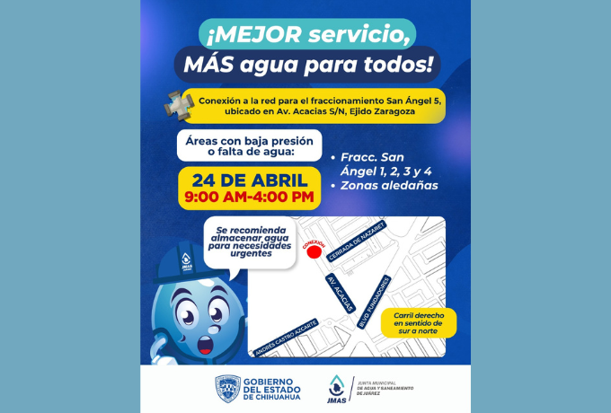 La Junta de Agua y Saneamiento de Juárez realizará este próximo viernes 24 de abril, la conexión a la red general de agua potable al fraccionamiento San Ángel 5, ubicado en avenida Acacias, Ejido Zaragoza.