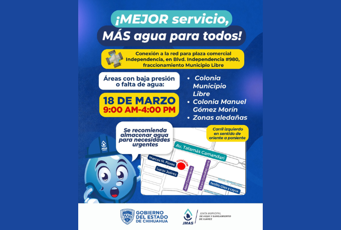 La Junta de Agua y Saneamiento de Juárez anunció la conexión de una plaza comercial a la red general de agua potable este miércoles 18 de marzo, lo que provocará afectaciones en el suministro del servicio en diversas colonias de Ciudad Juárez, además de complicaciones viales en la zona intervenida.