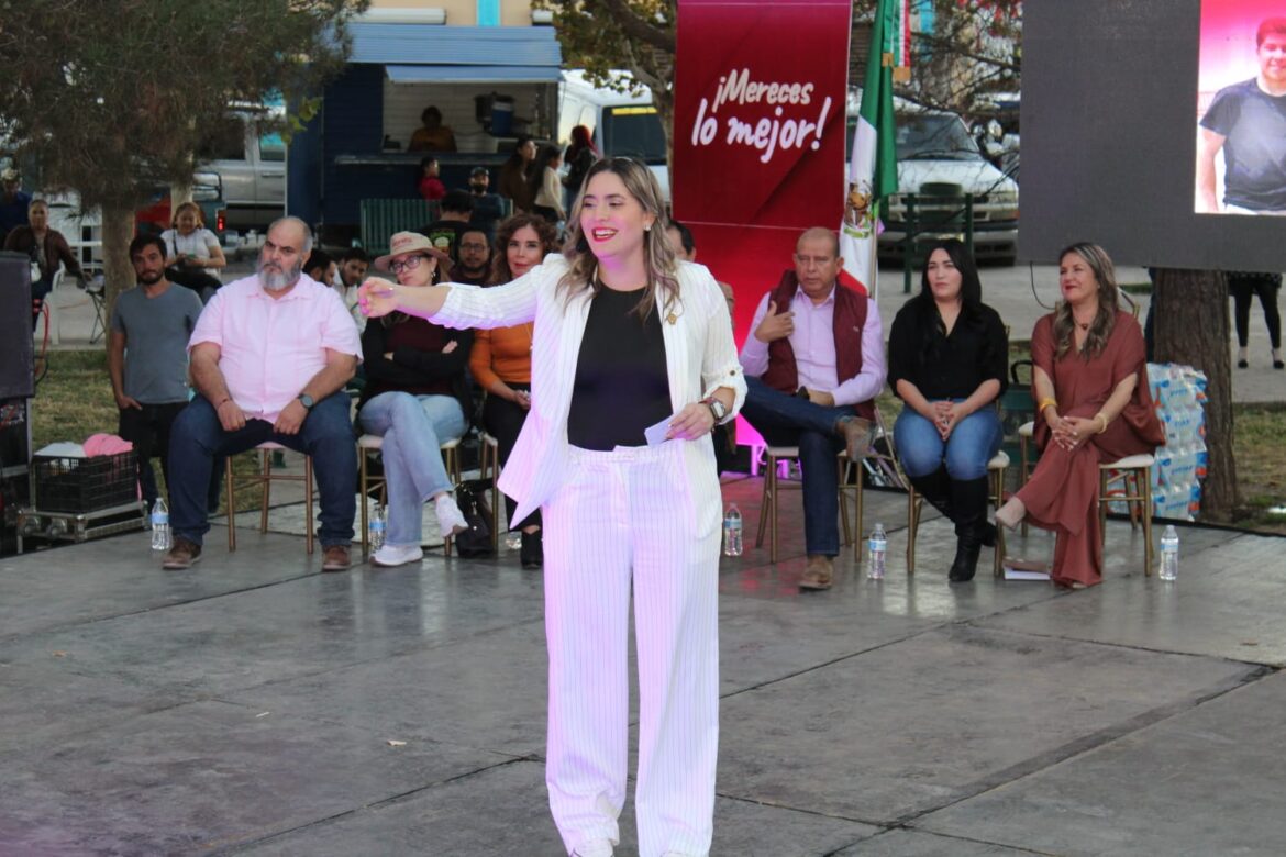 Con un estilo fresco y jovial, pero además viendo a los ojos de las familias reunidas en la plaza pública, la joven legisladora denunció que Gobierno del Estado ha intentado lucrar hasta con la educación de miles de niñas y niños, reteniendo por más de 60 días, los libros de texto, los cuales están considerados como un derecho fundamental de la Construcción Política.