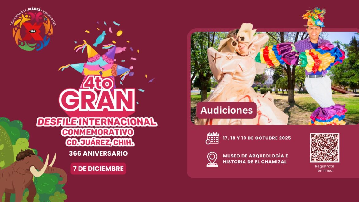 El Gran Desfile Conmemorativo 2025 de Ciudad Juárez abre sus audiciones los días 17, 18 y 19 de octubre en el Museo de Arqueología e Historia de El Chamizal, a partir de las 10:00 de la mañana. Esta convocatoria está dirigida a personas mayores de 16 años interesadas en participar en la tradicional celebración del 366 aniversario de la ciudad.