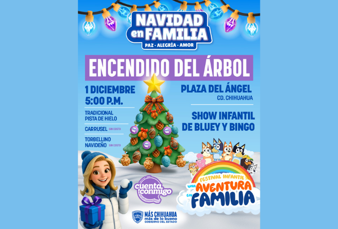 El Gobierno del Estado anunció que el tradicional encendido del Árbol de Navidad se llevará a cabo este 1 de diciembre en la Plaza del Ángel, en un evento encabezado por la gobernadora Maru Campos. Las actividades comenzarán a las 17:30 horas e incluirán el espectáculo infantil “En busca de la Navidad” protagonizado por Bluey y Bingo, además de la presencia de personajes como El Grinch y Santa Claus para el disfrute de las familias chihuahuenses.