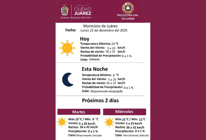 La Dirección General de Protección Civil del Municipio informó que este lunes 22 de diciembre se esperan condiciones climáticas mayormente favorables para la ciudad, con cielo soleado, temperaturas agradables durante el día y mínima probabilidad de lluvia, lo que permitirá el desarrollo normal de actividades al aire libre.