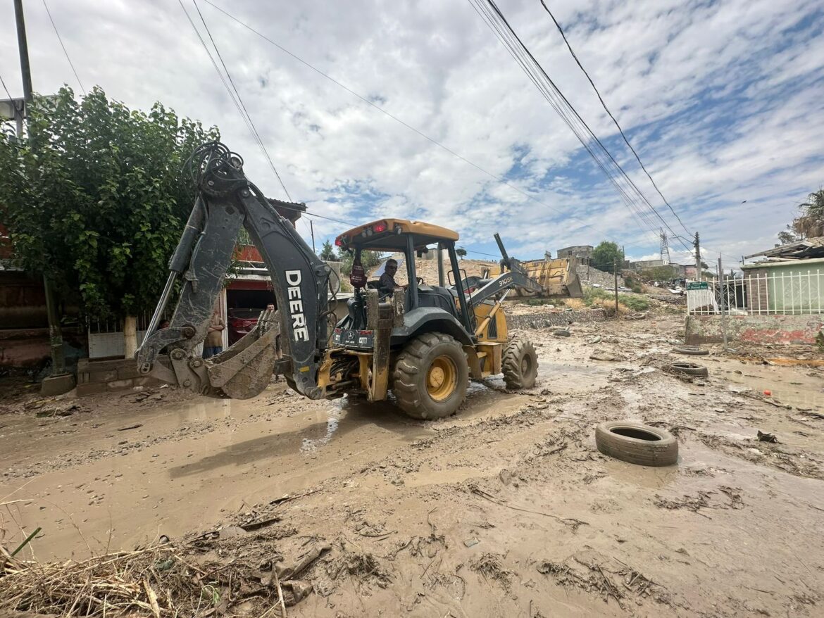 Dando continuidad a las labores de apoyo para las familias que se vieron afectadas por las lluvias de ayer, la Dirección General de Obras Públicas trabaja en la colonia Fronteriza en la limpieza y rastreo de calles dañadas por la fuerte corriente de agua.