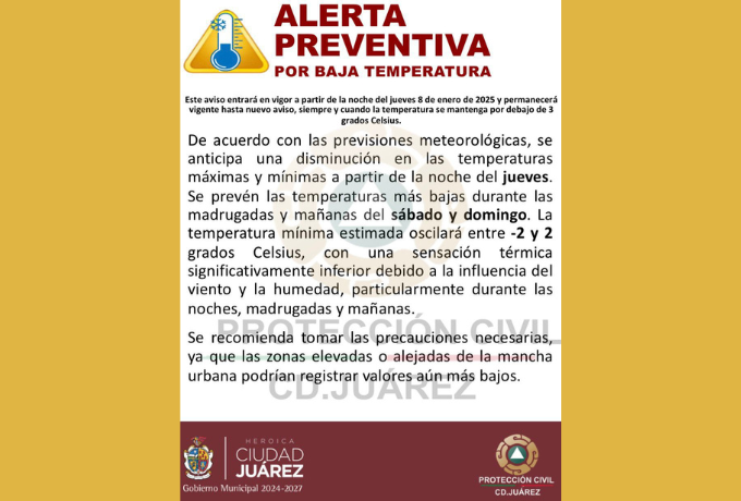 La Dirección General de Protección Civil emitió una alerta preventiva por bajas temperaturas para Ciudad Juárez, la cual entrará en vigor a partir de la noche del jueves 8 de enero y se mantendrá activa hasta nuevo aviso, siempre y cuando las temperaturas se mantengan por debajo de los 3 grados Celsius.