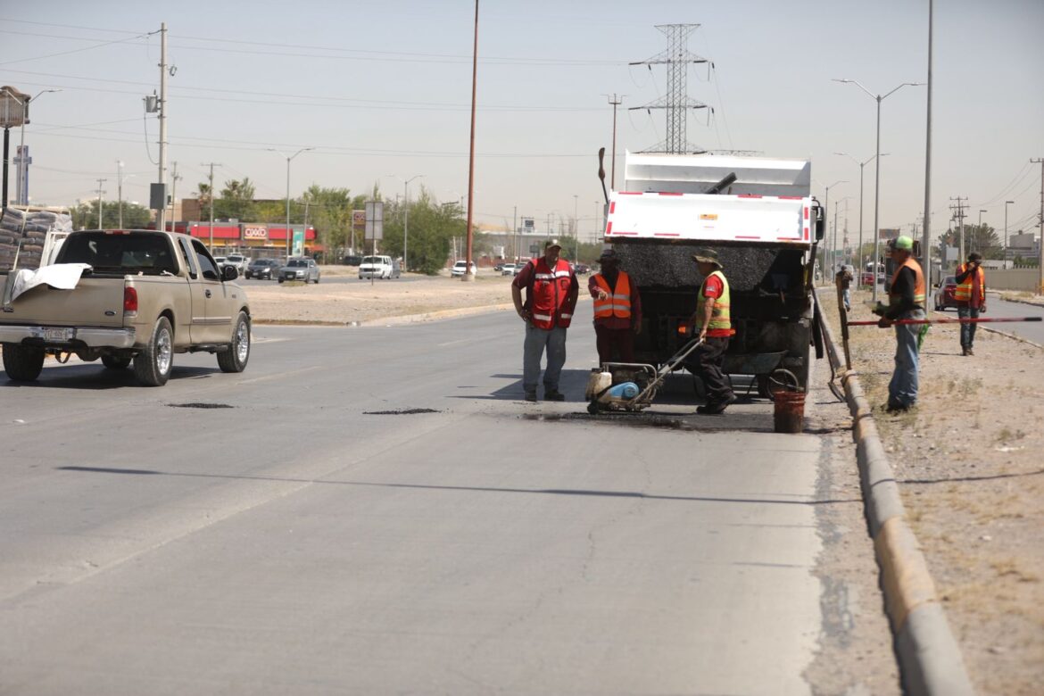 La Dirección General de Obras Públicas trabaja de manera simultánea con bacheo en las avenidas por distintos sectores de la ciudad, entre ellas en la De las Torres, boulevard Juan Pablo II, boulevard Zaragoza y el Eje Vial Juan Gabriel, tapando hasta este día 177 baches en esas cuatro vialidades.