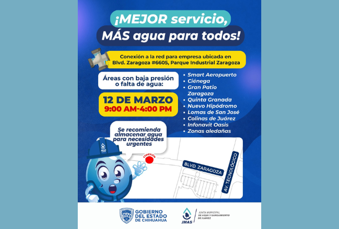 La Junta de Agua y Saneamiento de Juárez (JMAS) informó que este jueves 12 de marzo se realizará la conexión de una nueva planta industrial a la red general de agua potable, ubicada en el Parque Industrial Zaragoza. Los trabajos se efectuarán de 9:00 a 16:00 horas sobre el camellón central del bulevar Zaragoza, por lo que se recomienda a los conductores extremar precauciones ante la presencia de maquinaria pesada y maniobras en la zona.