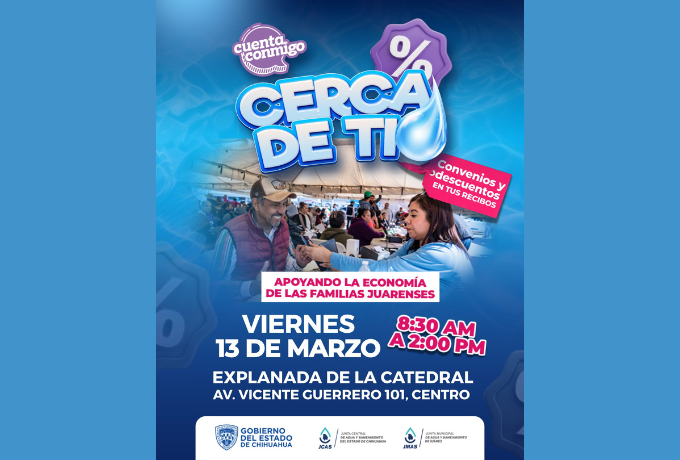La Junta Municipal de Agua y Saneamiento de Ciudad Juárez (JMAS) iniciará una serie de jornadas semanales denominadas “Cerca de ti”, con el objetivo de facilitar a los usuarios la regularización de adeudos mediante una unidad móvil que recorrerá distintos sectores de la ciudad. El programa arrancará este 13 de marzo en la explanada de la Catedral de Ciudad Juárez, ubicada en la Zona Centro, en un horario de 8:00 a 14:00 horas.