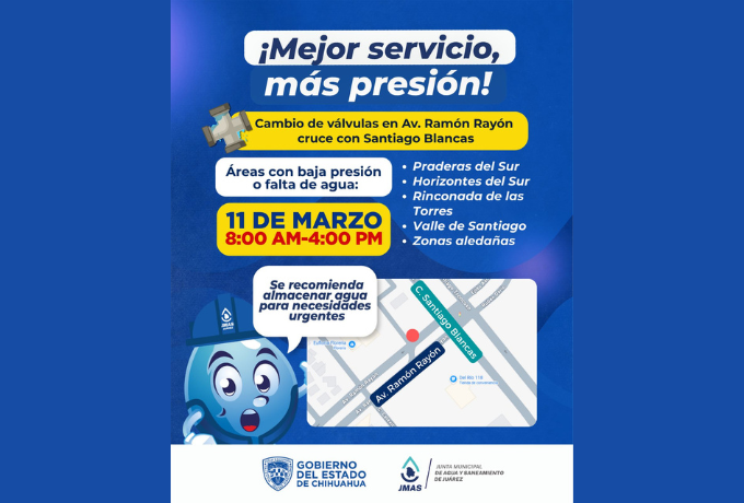 La Junta de Agua y Saneamiento de Juárez informó que este miércoles 11 de marzo realizará trabajos de sustitución de válvulas al sur oriente de la ciudad, con el objetivo de mejorar el suministro de agua potable y la operación de la red hidráulica. La intervención se llevará a cabo de 8:00 a 16:00 horas en el cruce de avenida Ramón Rayón y Santiago Blancas.