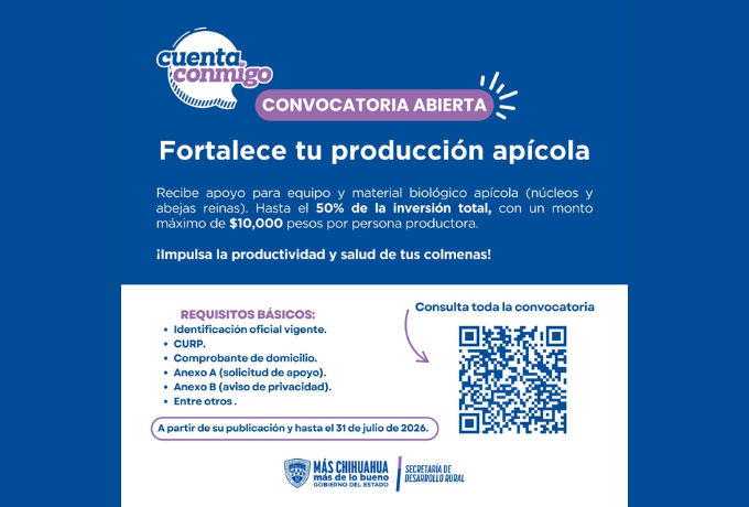 El Gobierno del Estado de Chihuahua, a través de la Secretaría de Desarrollo Rural, anunció la apertura del esquema de Apoyos para Equipamiento e Infraestructura Rural del programa “Cuenta Conmigo en el Campo”, dirigido a apicultores de la entidad. Esta estrategia contempla subsidios de hasta el 50 por ciento de la inversión, con un tope de 10 mil pesos por productor, con el objetivo de fortalecer la productividad del sector.