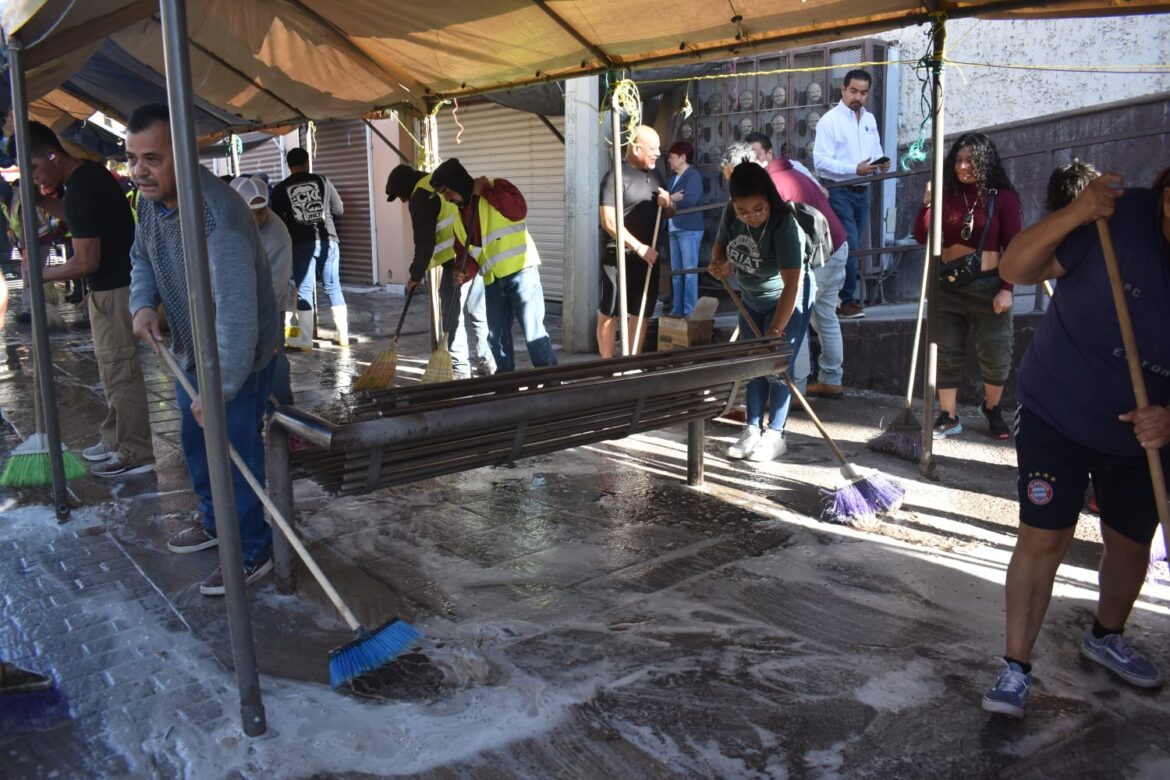 Solís subrayó la activa participación de líderes y comerciantes organizados, quienes se sumaron voluntariamente al operativo que arrancó en el cruce de las calles Mina e Ignacio Mariscal, atrás del Mercado Cuauhtémoc.