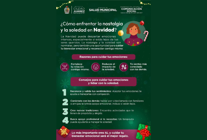 La funcionaria explicó que las fiestas decembrinas suelen generar una carga emocional adicional debido a expectativas sociales de felicidad y estabilidad que no siempre coinciden con la realidad personal. A esto se suman la nostalgia por la lejanía de seres queridos, conflictos familiares, recuerdos de pérdidas recientes o dificultades económicas, situaciones que pueden detonar o agravar estados de ánimo negativos si no se atienden a tiempo. Por ello, la Dirección de Salud recomendó buscar apoyo oportuno y mantener hábitos saludables como parte de la estrategia integral de bienestar impulsada por el Gobierno Municipal encabezado por el alcalde Cruz Pérez Cuéllar.
