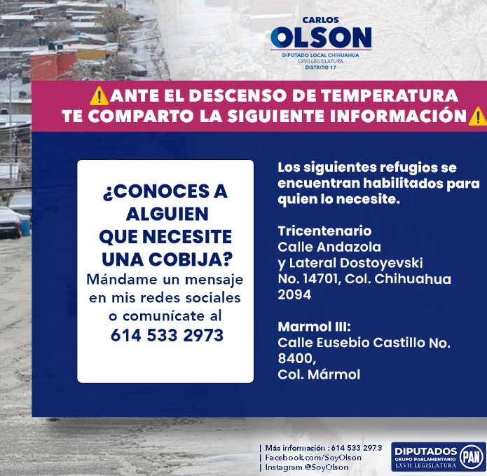 Chihuahua, Chih.- En medio de las frías temperaturas que azotan a la ciudad de Chihuahua, el diputado Carlos Olson hace un llamado a la ciudadanía a unirse en solidaridad y brindar apoyo a quienes enfrentan las inclemencias del clima.