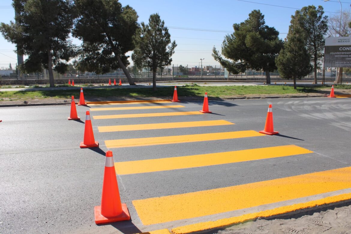 Personal del área de Control de Tráfico de la Coordinación General de Seguridad Vial, pintó los pasos peatonales frente al lugar conocido como El Punto, donde se encuentra el centro de atención a migrantes construido por el Gobierno Federal.