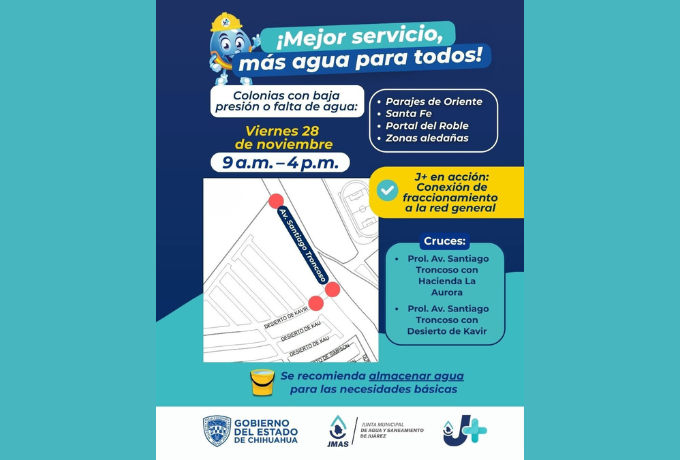 Vecinos de varias colonias del suroriente de Ciudad Juárez enfrentarán baja presión o falta total de agua este viernes 28 de noviembre, anunció la Junta Municipal de Agua y Saneamiento (JMAS). La suspensión temporal ocurrirá de 9:00 de la mañana a 4:00 de la tarde, debido a los trabajos de conexión de un nuevo fraccionamiento a la red general.