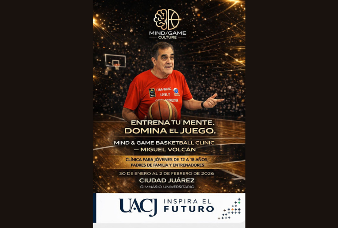 La Universidad Autónoma de Ciudad Juárez anunció el lanzamiento de la Clínica de Basquetbol “Mind y Game”, un proyecto de formación deportiva de alto nivel que será encabezado por el reconocido instructor italo-uruguayo Miguel Arcángel Volcán Sánchez, acreditado por la FIBA y la Asociación Mundial de Entrenadores de Baloncesto. La presentación oficial se realizará mediante una rueda de prensa el próximo 21 de enero de 2026 en la Rectoría de la UACJ.