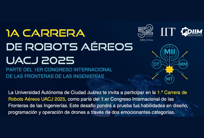 La Universidad Autónoma de Ciudad Juárez (UACJ) anunció la Primera Carrera de Robots Aéreos, un evento que reunirá a estudiantes con habilidades en robótica, inteligencia artificial, programación e ingeniería en un entorno competitivo y colaborativo. La actividad forma parte del 1.er Congreso Internacional de las Fronteras de las Ingenierías y se realizará este viernes 28 de noviembre a las 16:00 horas en el Centro de Entrenamiento Deportivo Universitario (CEDU).