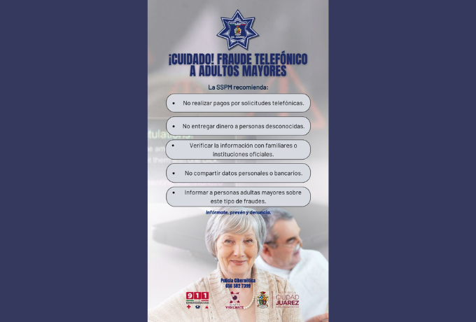 La Secretaría de Seguridad Pública Municipal (SSPM) de Ciudad Juárez lanzó una alerta a la ciudadanía por una nueva modalidad de fraude telefónico dirigida principalmente a personas adultas mayores, en la que delincuentes se hacen pasar por gestores, notarios o supuestos representantes de dependencias para exigir pagos bajo engaños relacionados con trámites de propiedad.
