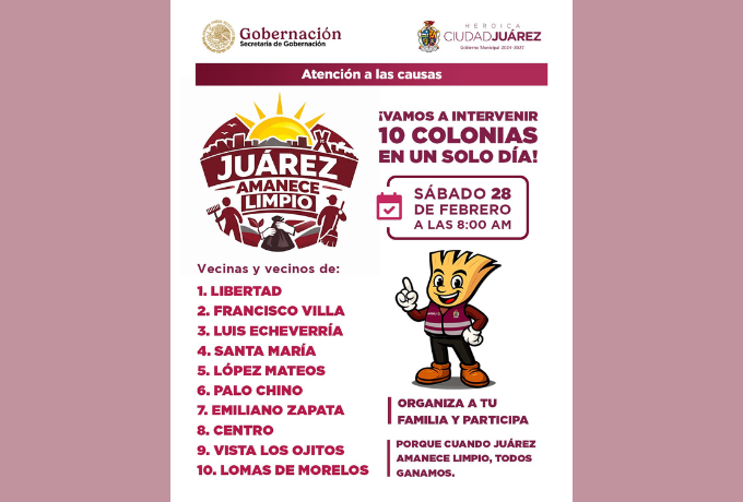 Este sábado 28 de febrero a las 8:00 de la mañana inicia el programa Juárez Amanece Limpio, una estrategia que contempla la intervención de 110 colonias durante 2026 en Ciudad Juárez, como parte del esquema Atención a las Causas, Juárez por la Paz. La jornada arrancará con la limpieza simultánea en 10 sectores, en un esfuerzo coordinado entre dependencias municipales y la participación ciudadana.
