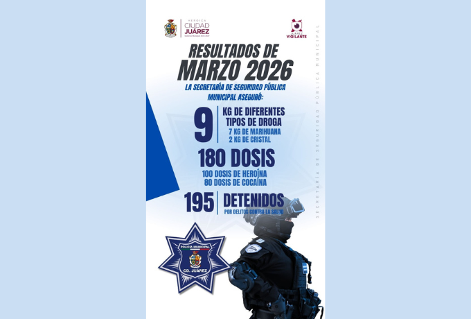 La Secretaría de Seguridad Pública Municipal reportó resultados favorables durante marzo en el combate a delitos contra la salud, con el aseguramiento de diversas sustancias ilícitas y la detención de 195 personas en distintos puntos de Ciudad Juárez, como parte de operativos permanentes de prevención y vigilancia.