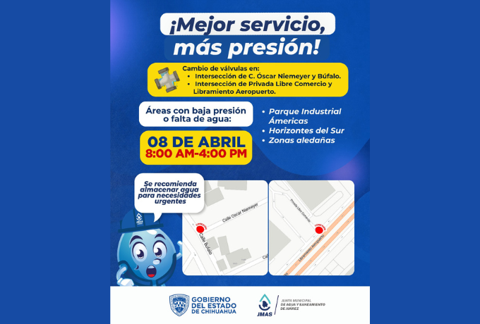 Este miércoles 8 de abril, la Junta de Agua y Saneamiento de Juárez realizará el cambio de dos válvulas para la mejora del servicio, debido a que ambas cumplieron su vida útil.