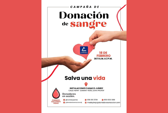 Una sola donación puede convertirse en esperanza para varios pacientes. Con ese mensaje, la Cámara Nacional de Comercio (Canaco) convocó a la comunidad juarense a participar en su próxima campaña de donación de sangre, programada para el 18 de febrero, con el objetivo de apoyar a personas que requieren transfusiones y fortalecer la cultura de la donación altruista en la ciudad.