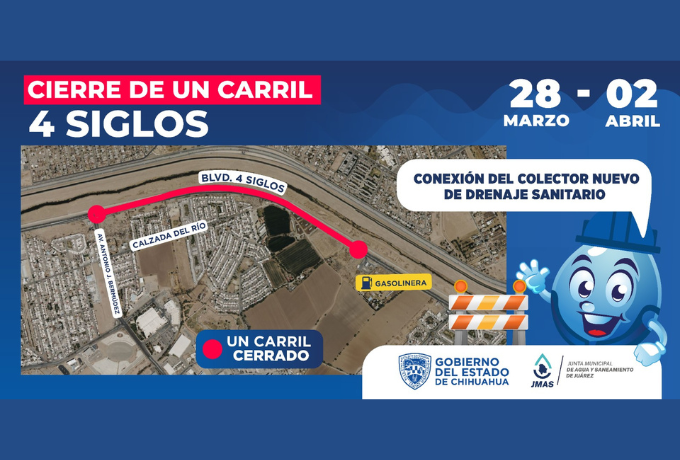 La Junta de Agua y Saneamiento de Juárez, trabajará en la conexión del nuevo colector Cuatro Siglos con la red existente, por lo que habrá un cierre temporal a la circulación vehicular.