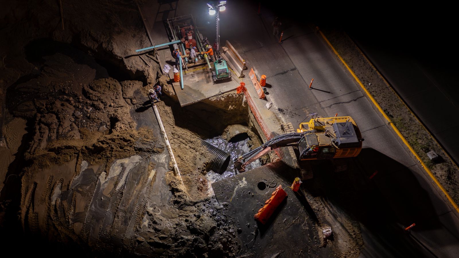 Posteriormente, a partir de las 10:00 de la noche del domingo y hasta las 4:00 am del lunes, se realizaron trabajos de demolición de la tubería de concreto existente, con el objetivo de instalar y conectar el nuevo colector de 96 pulgadas, fabricado en polietileno de alta durabilidad, con una vida útil estimada de aproximadamente 50 años.