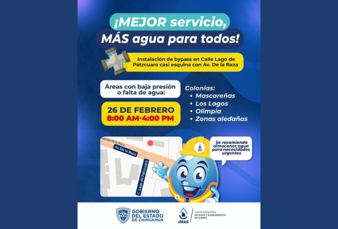 La Junta Municipal de Agua y Saneamiento (JMAS) de Ciudad Juárez informó que mañana se suspenderá el suministro de agua en varios fraccionamientos alrededor del crucero de la avenida De la Raza y la calle Lago de Pátzcuaro. La interrupción se debe a la instalación de un bypass como parte de los trabajos de sectorización del distrito 5.