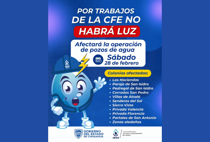 La Junta Municipal de Agua y Saneamiento de Ciudad Juárez informó que este sábado 28 de febrero se verá afectado el servicio de agua potable en diversos sectores de Ciudad Juárez debido a trabajos programados por la Comisión Federal de Electricidad (CFE). La suspensión de energía eléctrica se realizará de 4:00 a.m. a 10:00 a.m., lo que dejará temporalmente fuera de operación varios pozos que abastecen a la zona.