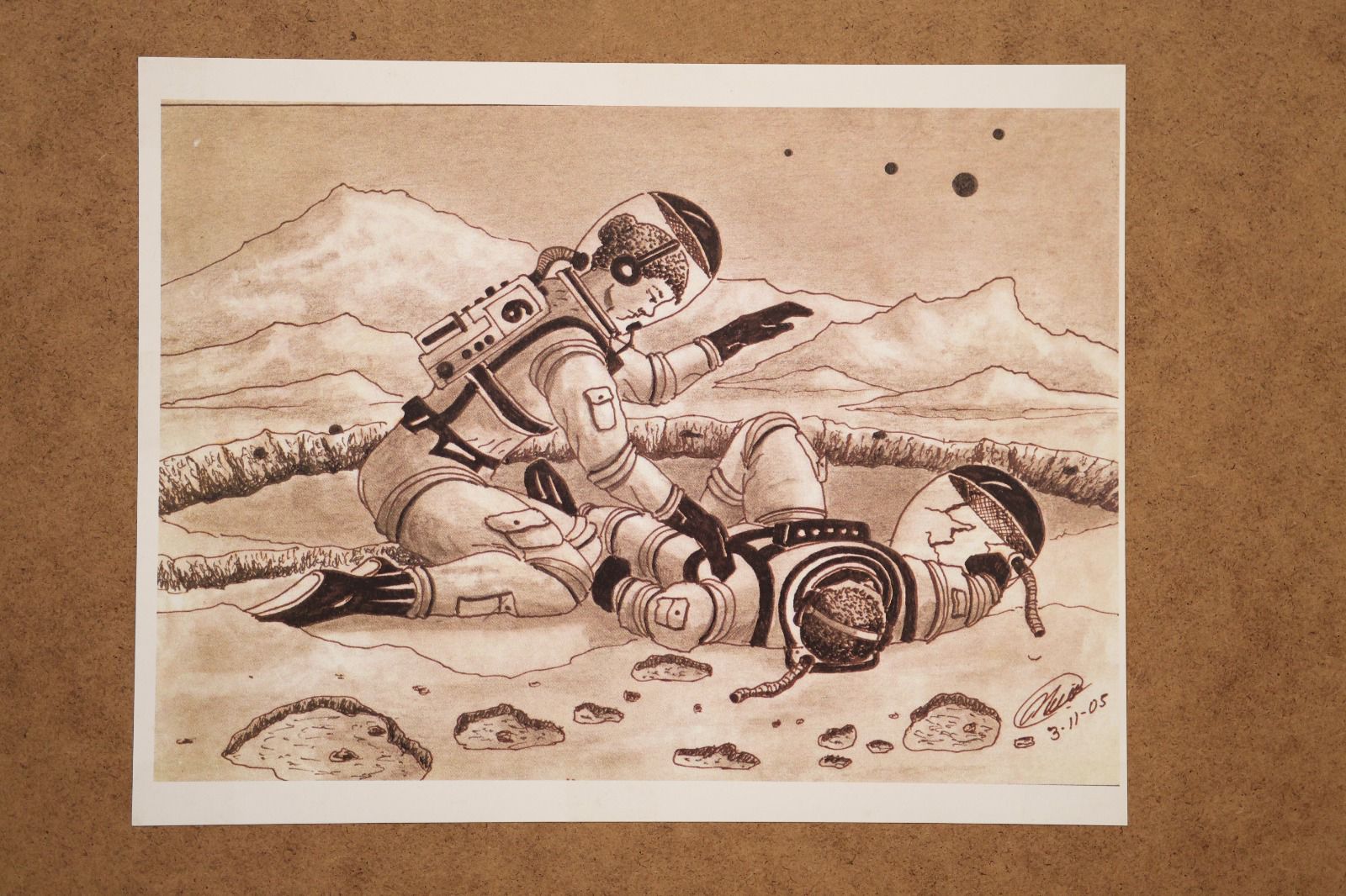 El autor detalló que aunque comúnmente se perciben como blanco y negro, sus obras están construidas a partir de una gama de tonos grises, lo que permite generar profundidad y matices. Posteriormente, algunas piezas son reproducidas en sepia para aportar una sensación de antigüedad y reforzar la atmósfera de la ciencia ficción clásica.