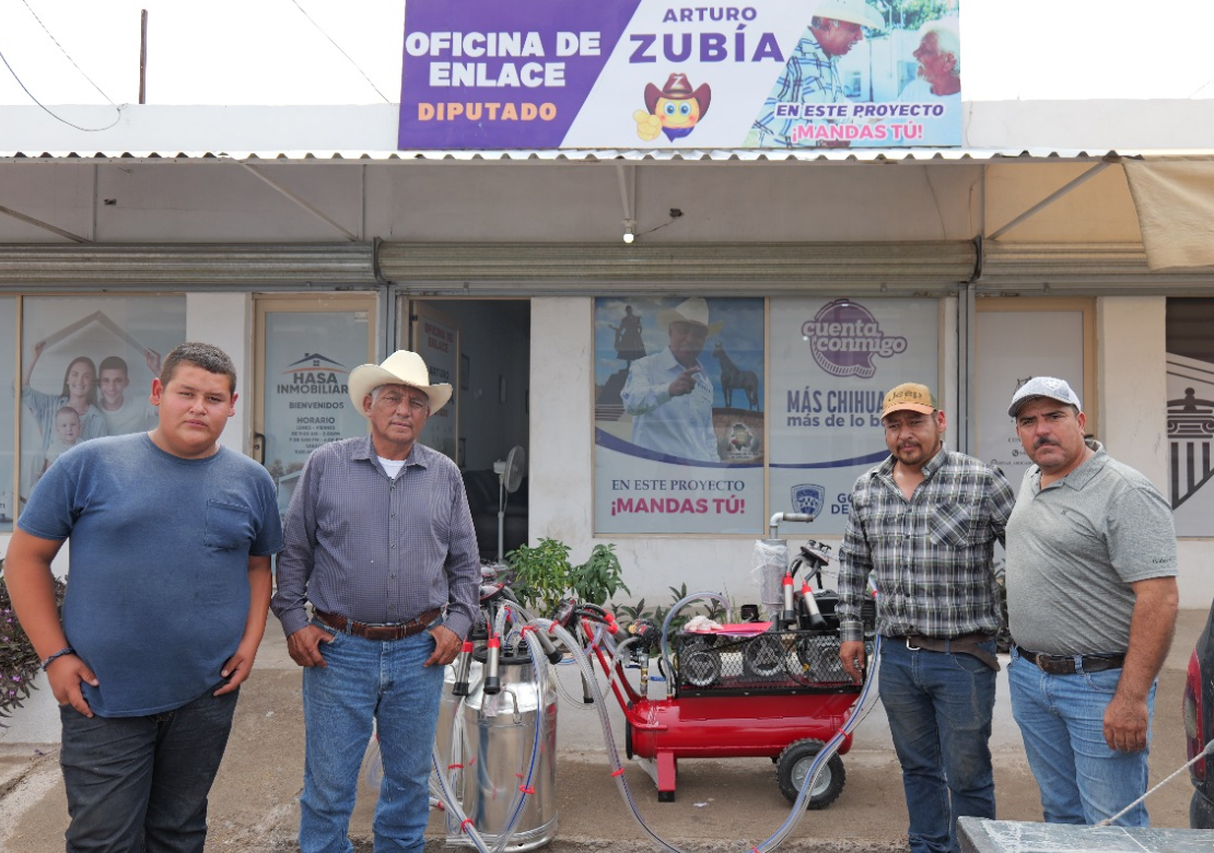 Camargo, Chih.– Como parte del Programa de Transferencia de Tecnología de la Secretaría de Desarrollo Rural del Gobierno del Estado, el diputado Arturo Zubia hizo entrega, en la oficina de enlace de Camargo, de un apoyo a David Ramos, uno de los primeros beneficiarios de este esquema, con el propósito de modernizar el sistema de ordeña que él y su familia utilizan en su producción.