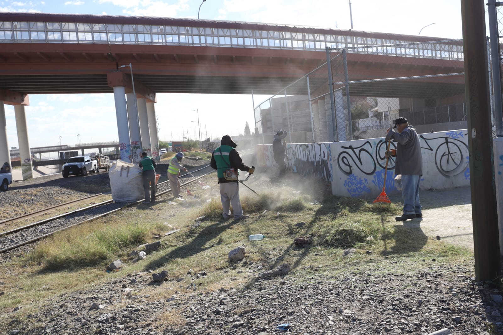 Las cuadrillas comenzaron las labores desde la Plaza de la Mexicanidad, punto de salida y meta del recorrido, donde realizan limpieza general, retiro de hierba, tiliches, llantas y montones de tierra dispuestos de manera indebida. En los trabajos utilizan también un mini cargador para remover material acumulado.