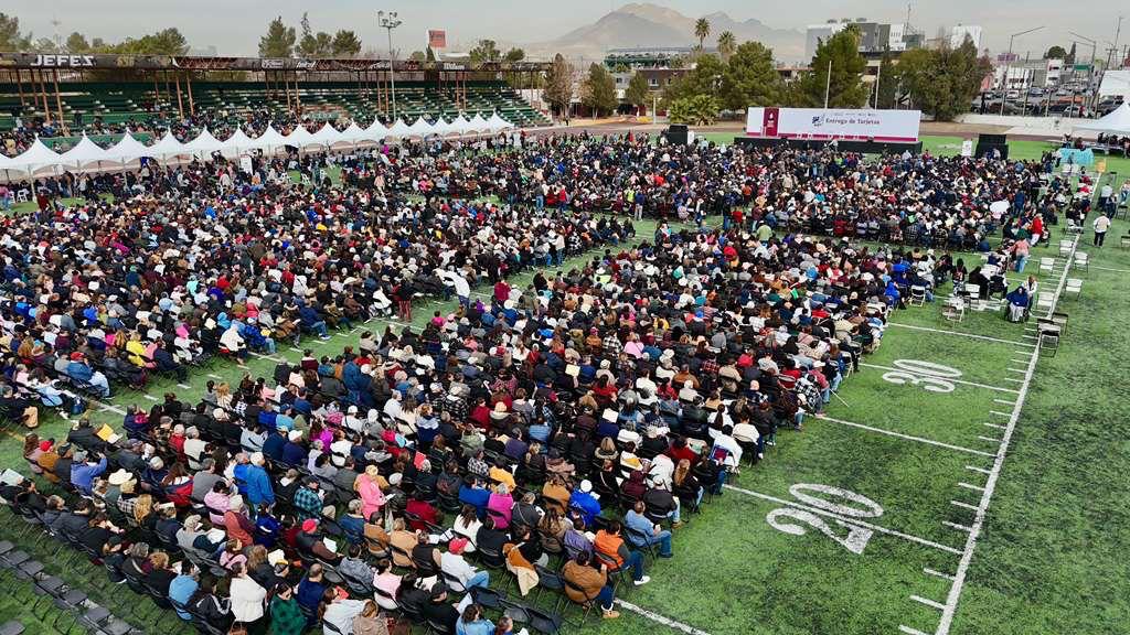 La delegada estatal de Programas para el Bienestar en Chihuahua, Mayra Chávez Jiménez, junto con el Director Regional en Juárez, Omar Helem García Palomares, encabezó la entrega de tarjetas de Banco Bienestar a nuevos beneficiarios de las pensiones para personas adultas mayores y mujeres de 60 a 64 años. La actividad se realizó en las instalaciones del Estadio 20 de Noviembre en Ciudad Juárez.