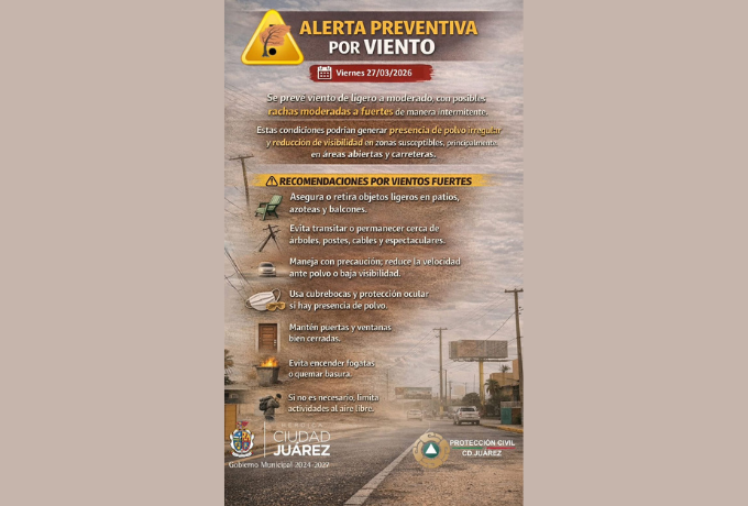 La Dirección General de Protección Civil advirtió que este viernes 27 de marzo se registrarán vientos de intensidad ligera a moderada en Ciudad Juárez, con rachas que podrían alcanzar niveles fuertes de manera intermitente. El fenómeno se intensificará a lo largo del día, generando condiciones de riesgo como tolvaneras, baja visibilidad y posibles afectaciones en zonas abiertas y carreteras.
