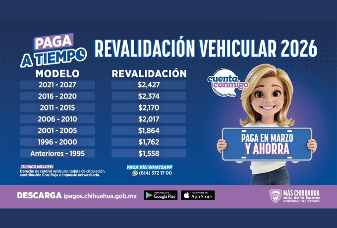 La Secretaría de Hacienda del Gobierno del Estado de Chihuahua invitó a los propietarios de automóviles a aprovechar los descuentos vigentes durante marzo en el trámite de revalidación vehicular. Las tarifas varían según el modelo del vehículo, con costos que van desde los 2 mil 427 pesos para unidades recientes hasta mil 558 pesos para modelos anteriores a 1995, como parte de una estrategia para incentivar el cumplimiento de obligaciones fiscales.