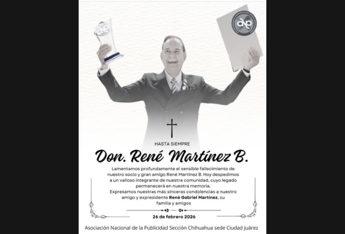 Ciudad Juárez despide a René Martínez Boisselier, uno de los pilares de la industria publicitaria fronteriza. Durante más de cinco décadas, su talento, creatividad y liderazgo dejaron una marca imborrable, formando y guiando a generaciones de profesionales y consolidando la publicidad local como referente regional. Su partida deja un vacío profundo, pero también un legado que seguirá inspirando.