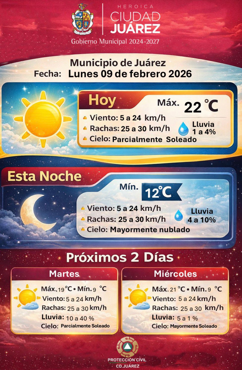 La Dirección de Protección Civil del Gobierno Municipal informó el pronóstico meteorológico para este lunes 9 de febrero, en el que se prevé un clima mayormente estable con temperaturas templadas durante el día.