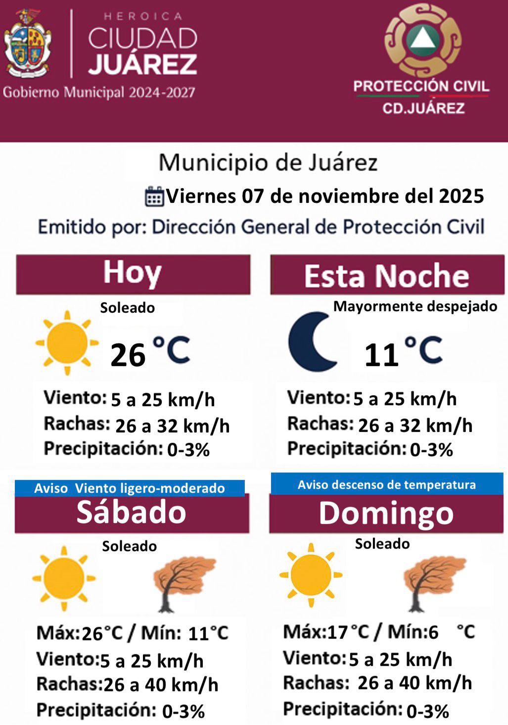 La Dirección General de Protección Civil del Gobierno Municipal informó que este viernes 7 de noviembre de 2025 prevalece un clima soleado en Ciudad Juárez, con una temperatura máxima de 26 grados centígrados y mínima de 11. El viento soplará de 5 a 25 kilómetros por hora, con rachas de hasta 32 kilómetros por hora y probabilidad de lluvia de entre 0 y 3 por ciento.