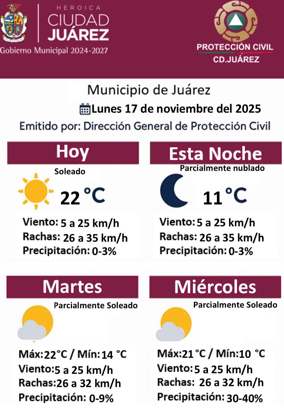 La Dirección General de Protección Civil del Municipio de Juárez informó el pronóstico del tiempo para este lunes 17 de noviembre de 2025 y los próximos días, destacando condiciones mayormente soleadas y un ligero aumento en la probabilidad de lluvias hacia mitad de semana.
