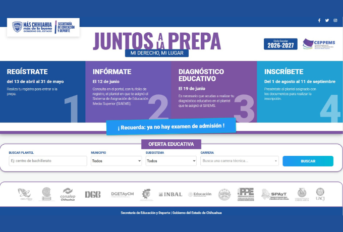 La Secretaría de Educación y Deporte anunció el inicio del Registro Único en Línea para aspirantes a Educación Media Superior del ciclo escolar 2026-2027, como parte de la estrategia “Juntos a la Prepa. Mi Derecho, Mi Lugar”. El proceso comenzará el próximo 13 de abril y concluirá el 31 de mayo, periodo en el que las y los estudiantes deberán registrarse en el portal oficial y seleccionar hasta tres opciones de planteles públicos de su preferencia.