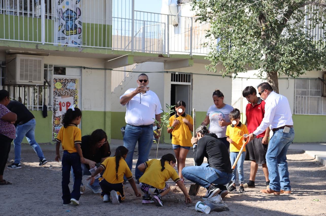 Como parte de las acciones para fortalecer el cuidado del medio ambiente y fomentar la educación ambiental en las nuevas generaciones, la Dirección de Parques y Jardines recibió la colaboración del Club Rotario Juárez y de la Fundación Grupo México en los trabajos de forestación y reforestación en la Escuela Primaria “José María Morelos y Pavón”.