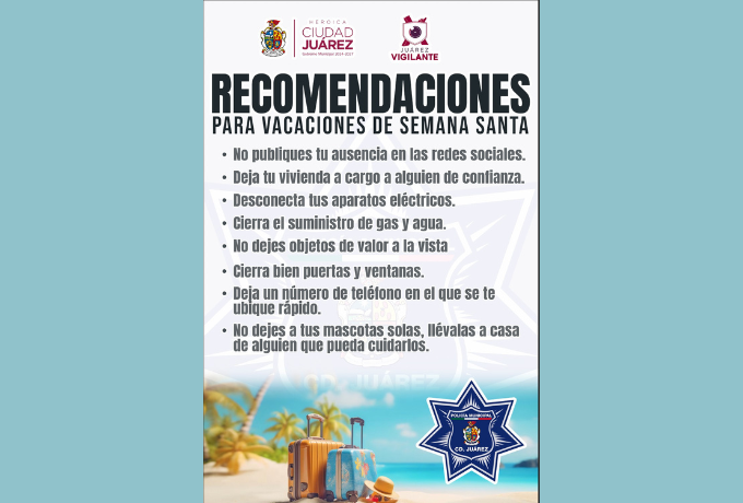 La Secretaría de Seguridad Pública Municipal exhortó a la ciudadanía a reforzar medidas de prevención durante el periodo vacacional de Semana Santa, con el fin de evitar incidentes y proteger tanto a las familias como su patrimonio. La dependencia destacó que la prevención es clave ante el aumento de movilidad y viviendas solas en estas fechas.