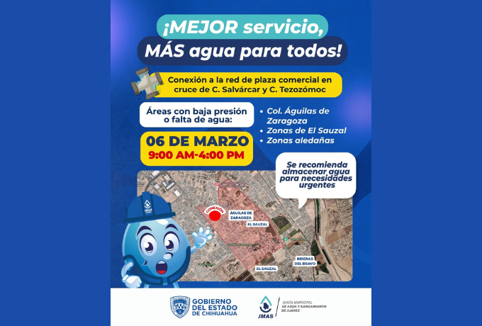 La Junta Municipal de Agua y Saneamiento de Juárez informó que este viernes 6 de marzo se suspenderá temporalmente el servicio de agua potable en varias colonias cercanas al sector de El Sauzal, debido a trabajos de conexión de una plaza comercial a la red general. Las labores se realizarán entre las 9:00 de la mañana y las 4:00 de la tarde, periodo durante el cual se podría registrar baja presión o falta total del suministro en algunos sectores.