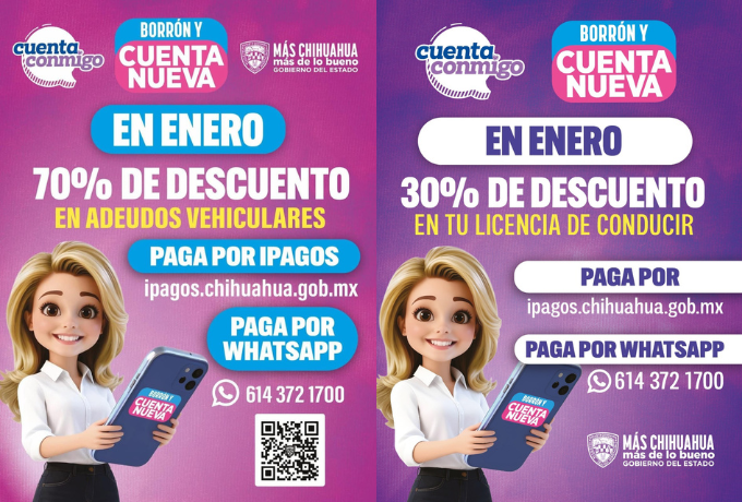 Para quienes tengan adeudos superiores a 10 mil pesos, se ofrece la posibilidad de realizar convenios de pago, cubriendo solo el 20% inicial y liquidando el resto mes a mes. Además, los contribuyentes pueden aprovechar los medios de pago alternos: vía WhatsApp al (617) 3721700, por la página ipagos.chihuahua.gob.mx o en los quioscos de pago instalados en centros comerciales y oficinas gubernamentales, ya con los descuentos aplicados. También continúan los convenios de pago vinculados a la Coespris para la expedición de constancias para establecimientos de venta de bebidas alcohólicas.